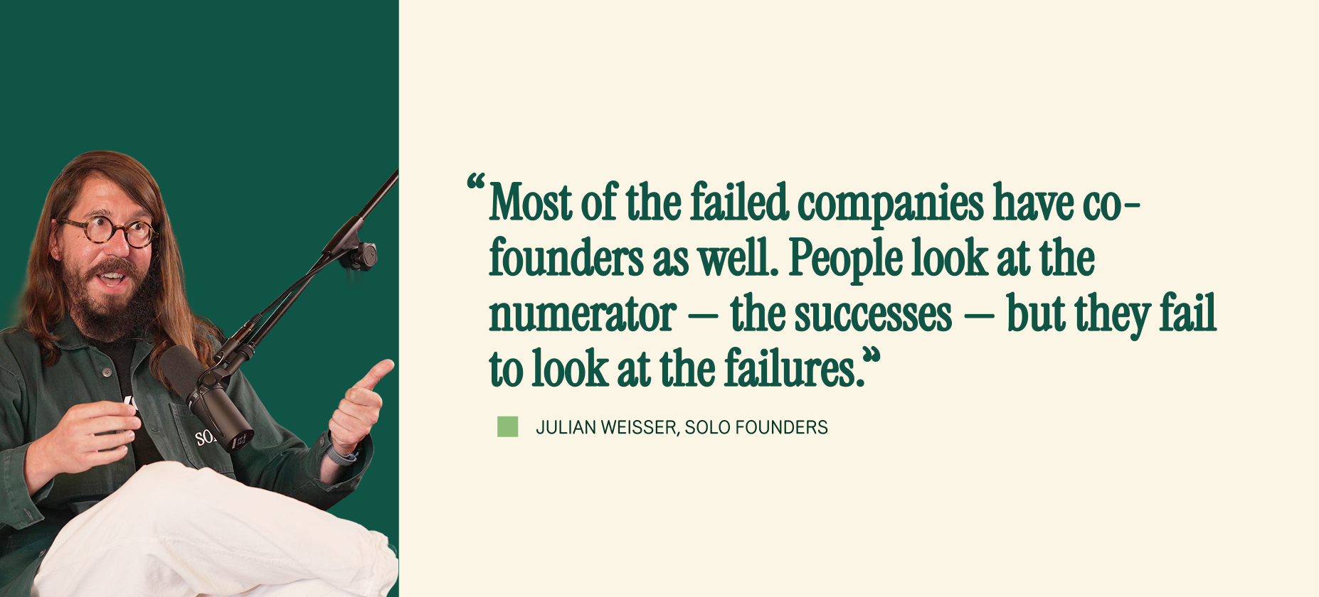 Once we use this framing, the common advice thins out. The "great co-founder pairing" still exists — Julian is emphatic that a truly aligned co-founder is a superpower — but he argues the bar should be far higher than the industry treats it. Taking on a co-founder because you think you're supposed to is what he calls a *co-founder of convenience*, and the downside is worse than going solo: years of your life spent, a company that implodes on interpersonal grounds, and no clean path back.