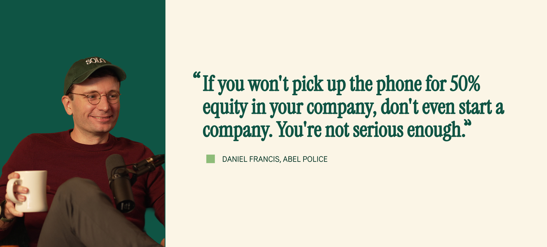 Daniel argues solo founders should be giving significantly more equity to early hires. They have the ownership to spare, and generous grants transform employees into co-owners. His CTO was someone who could have started his own company but chose Abel because the equity made him feel like a partner, not an employee.
