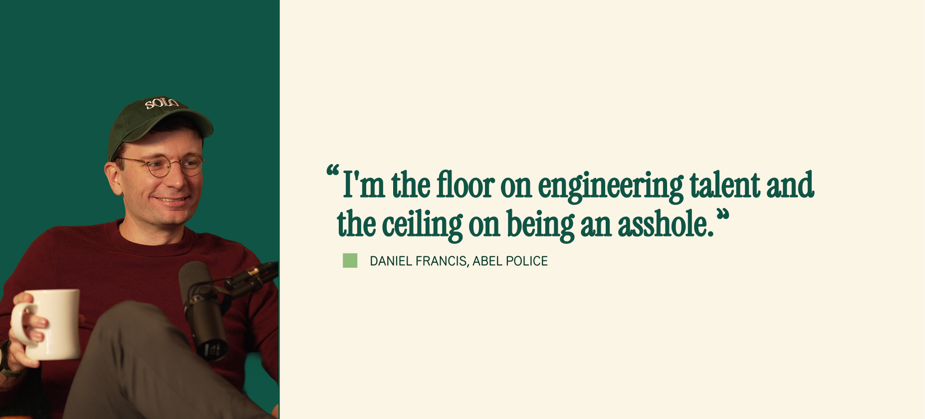 Abel has a document called "Working at Abel." The first bullet point: Daniel has to be the worst engineer and the biggest asshole on the team. He's the floor on engineering talent and the ceiling on being difficult to work with. Anyone who violates either of those standards has to go.