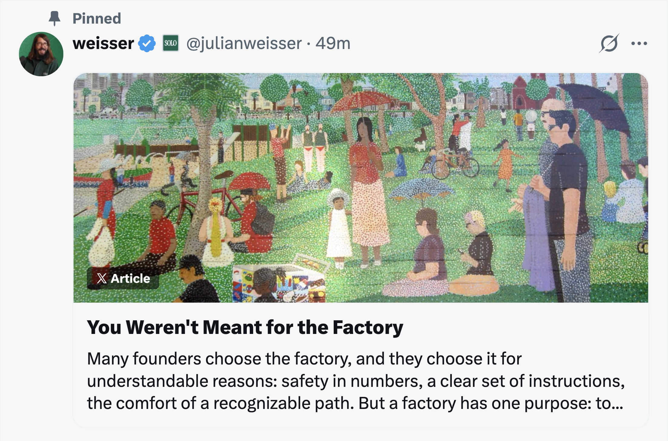 But the factory doesn't stop at common sense. It prescribes a specific team structure, a specific funding path, a specific sequence and applies it to every company regardless of context. Any one of these might be the right call for a specific founder at a specific moment, and painfully incorrect for another. The factory doesn't distinguish between what's universal and what's situational. That is what makes it dangerous.